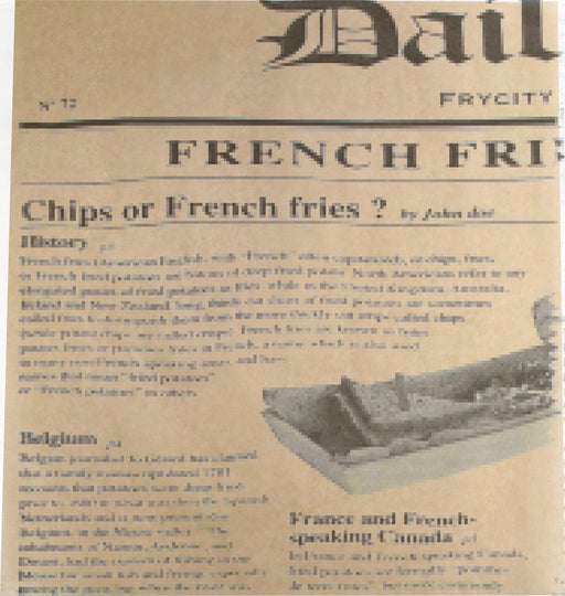 Apte au contact alimentairePapier alimentaire, imitation papier journal avec les news du "Daily News" imprimées sur une face, anti-graisse.Peut ser...