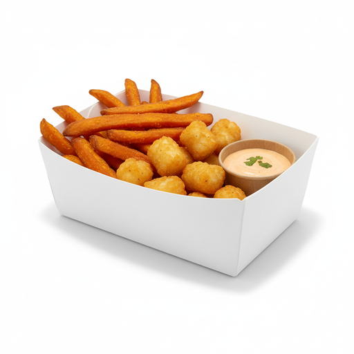 Petite barquette en carton recyclable, d'une couleur blanche classique, pour vos produits alimentaires, une petite portion de frites ou un dessert....