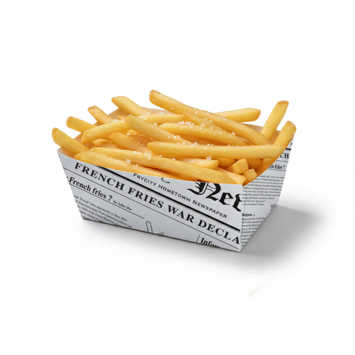 Barquette pour portion de fritesBarquette en carton recyclable, de couleur blanche avec en décor une impression rappellant le design de la une d'un...