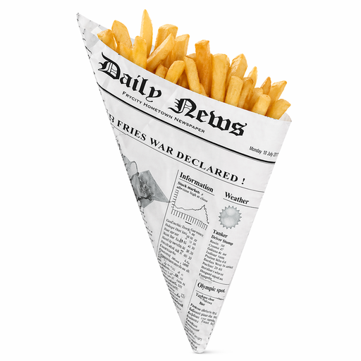 Petite portion de frites ou pour des bonbons à emporter Cornet alimentaire en carton, décor imitation papier journal. Quatre coins du cornet sont b...