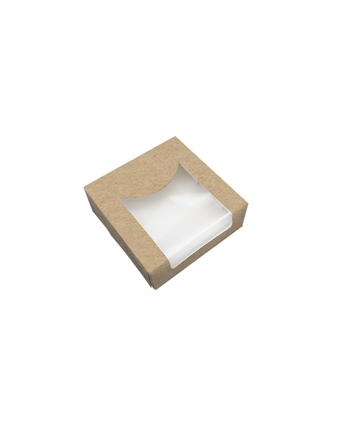 Boite pâtissière carton brun avec couvercle attaché à fenêtre PLA 120x120mm H50mm - 500Pcs