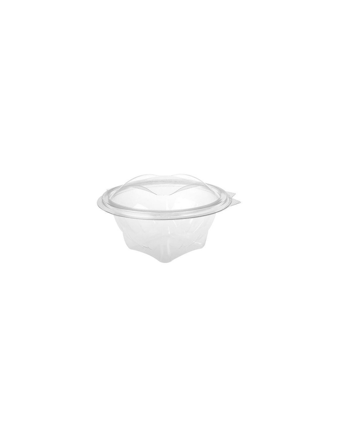 Bol à couvercle avec charnière, de 12 cm de diamètre et 7 cm de hauteur, en plastique transparent (fabrication par thermoformage), denviron 250g de contenance